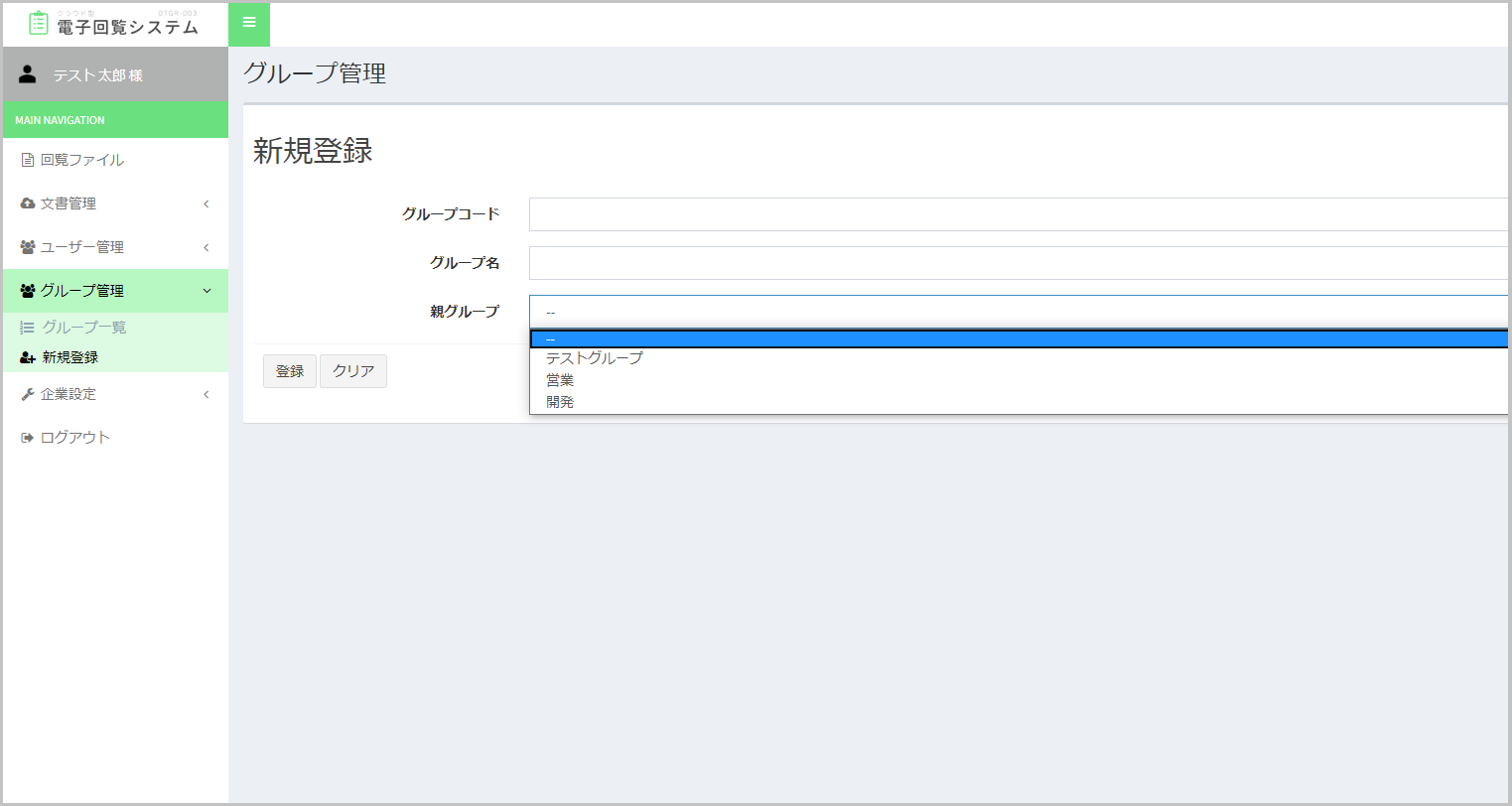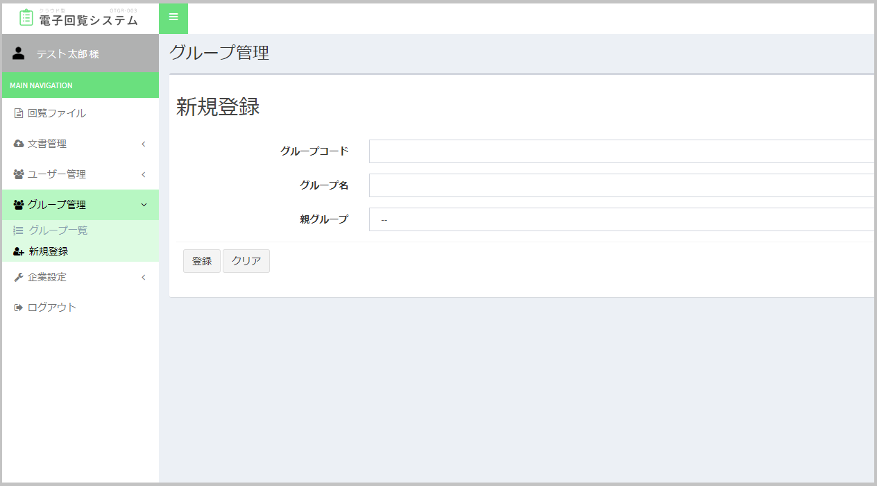 MAIN NAVIGATONの「グループ管理」をクリックし、「新規登録」を選択しましょう。