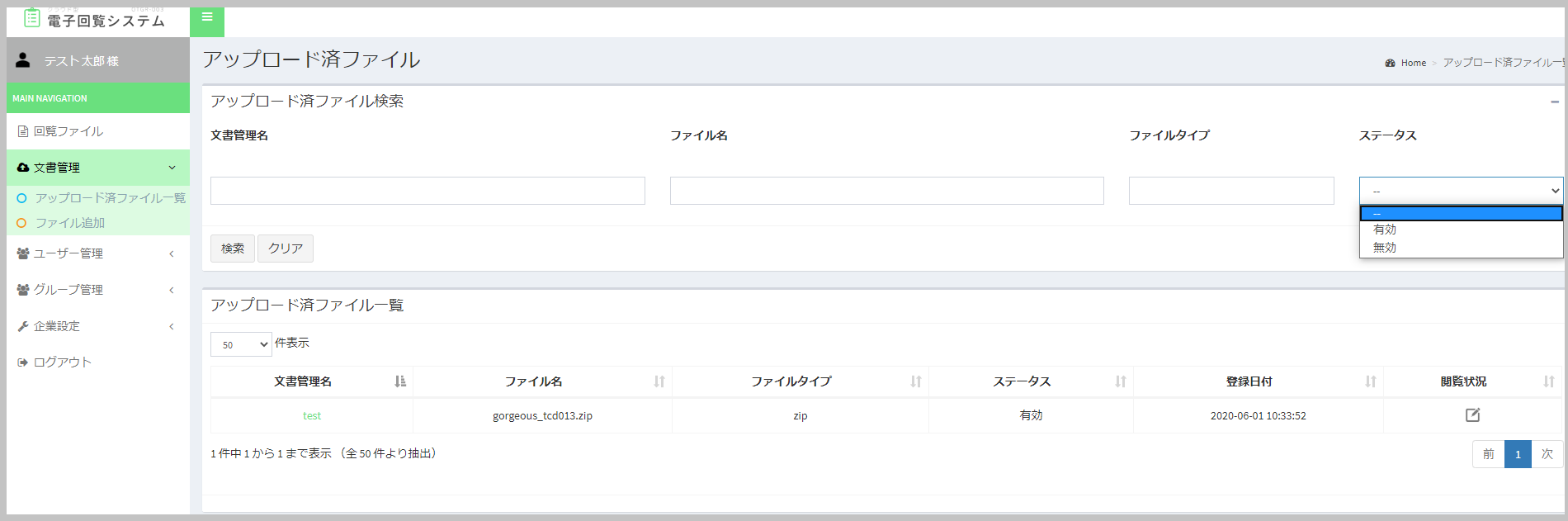 アップロード済みファイルの検索を行う場合には、任意の文書管理名、ファイル名、ファイルタイプを入力し、ステータスを選択しましたら,「検索」をクリックしてください。